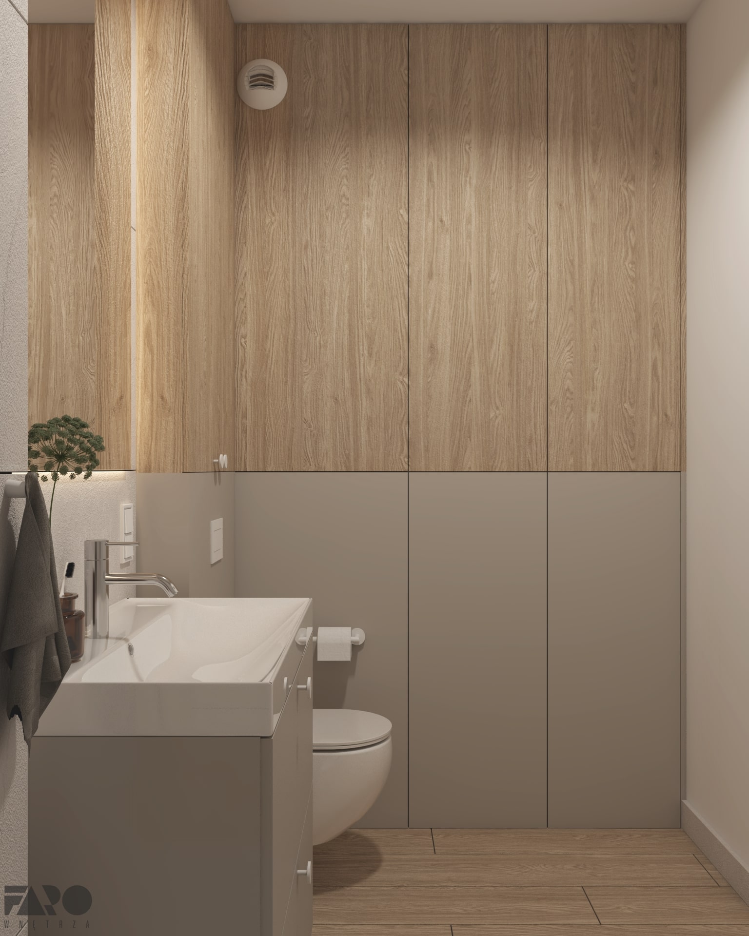 Łazienka ta została utrzymana w delikatnej beżowej tonacji płytek, która nadaje wnętrzu spokoju i przyjemnej atmosfery. Zabudowa meblowa o drewnopodobnej tonacji doskonale komponuje się z kolorystyką płytek, dodając wnętrzu ciepła i naturalnego uroku.